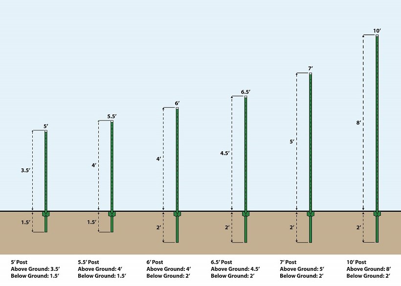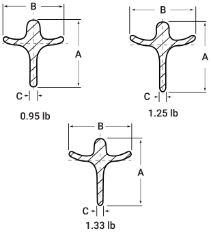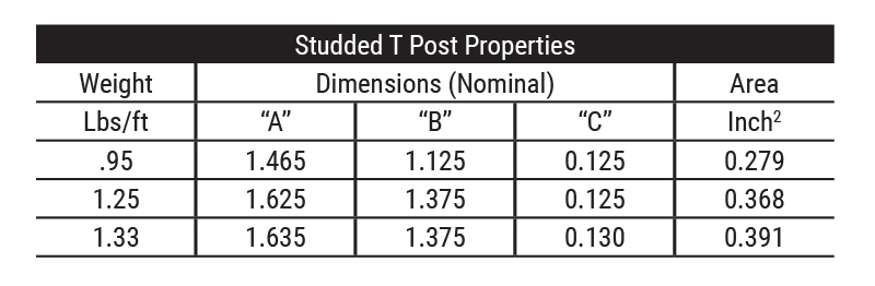 Studded “T” Posts: The weight of each post is 0.95, 1.25, or 1.33 lbs/ft. Studs are spaced uniformly along the length of the “T” shaped post.